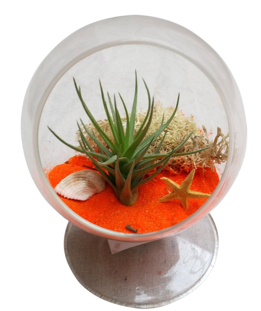 Tillandsia species (also called saprophytes or air plants) – i.e. they normally grow without soil can be attached to other plants, wood, ornaments, etc.